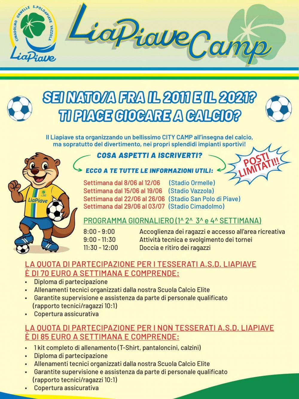 Sei nato/a fra il 2011 e il 2021? Ti piace giocare a calcio? Il Liapiave sta organizzando un bellissimo CITY CAMP all'insegna del calcio, ma soprattutto del divertimento, nei propri splendidi impianti sportivi!